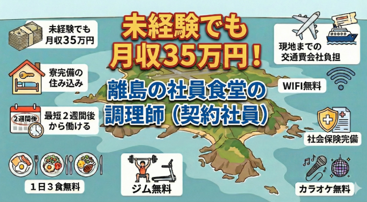 ※調理実務経験がない方でもOKです。 ※1日10時間程度の立ち仕事になりますので体力に自信がある方を歓迎します。 ※馬毛島には大きな病院がありませんので(診療所はあります)大きな疾患やケガがある方は選考不可となります。 (選考時に会社負担で健康診断を受けていただきます) ✅20~50代の方が活躍しております。 ✅選考から入社までに2~4週間掛かりますのですぐに入社したい方はおすすめしません。 |